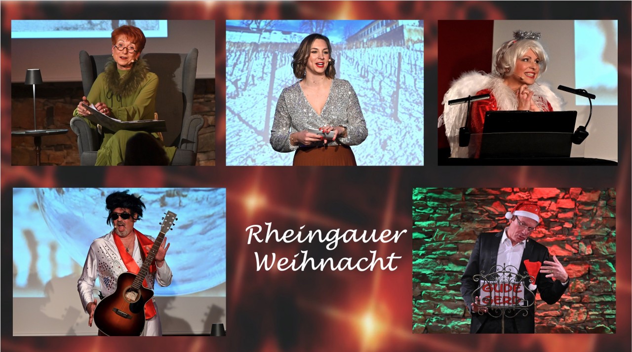 Die beliebte Weihnachtsrevue: Katharina Höfling (geb. Fladung) führt als charmante Rheingauer Moderatorin durch den weihnachtlichen Abend, bei dem im Finale auf der Bühne Weihnachtslieder gesungen werden. Die vielseitige Rheingauer Künstlerin Dunja Koppenhöfer setzt musikalische Glanzlichter, der Rheingauer Comedian Gerd Brömser sorgt mit seinen Fest Vorbereitungen für heitere Momente bei der Rheingauer Weihnacht. Frank Zimmermann begeistert mit einfühlsamen Liedern und Monika Albert vom Rheingauer Mundartverein erzählt Rheingauer Weihnachtsgeschichten in Mundart. Um die perfekte Technik kümmert sich Stephan Weber von STUDIO22.