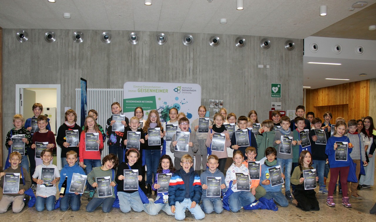 Vor allem auch dem Hochschulpräsidenten war anzumerken, dass ihm die Diplomübergabe besondere Freude machte: „Ich bin begeistert. Wir prägen hier offensichtlich die zukünftigen Genetiker und Windkraftanlagen-Ingenieurinnen, Drohnen-Spezialisten und Insekten-Forscherinnen“. Aus seiner Hand erhielten die Kinder alle eine Urkunde und Dr. Jost überreichte eine Uni-Tasche mit einer Flasche naturtrüben Apfelsaft aus der Hochschule, Kugelschreiber, Gummibärchen und einer einjährigen, kostenlosen Mitgliedschaft im VDI. Wolfgang Truss hielt fest: „Wir freuen uns, im Rahmen der Kinderuni auch im kommenden Jahr einen Zündfunken zur Begeisterung für Ingenieurberufe setzen zu können.“
