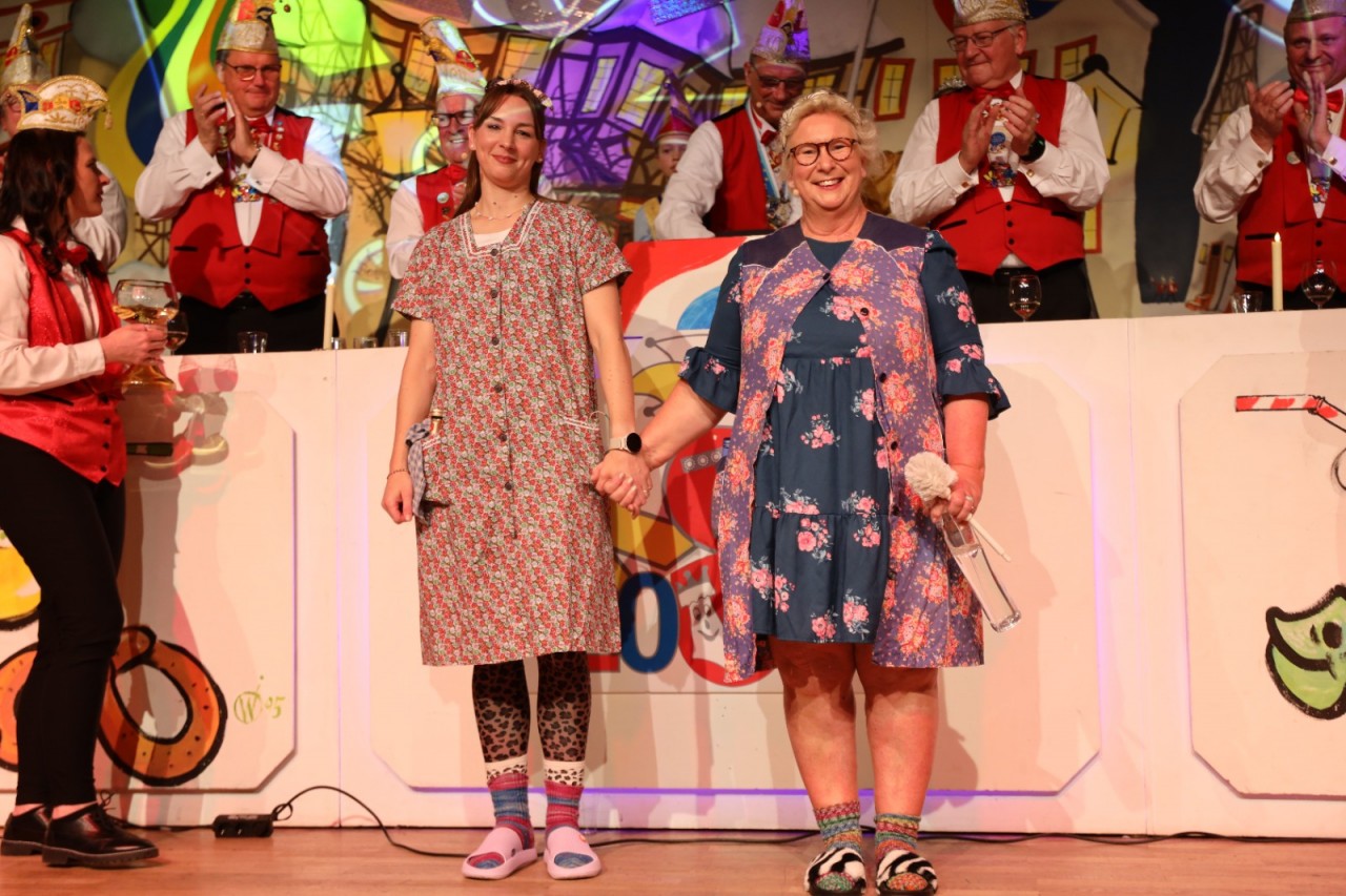 Mit dabei bei der KCV-Narretei war auch diesmal wieder „De Äppelmann vom Wochenmarkt“, Kevin Raupach, der sich ein ganz besonderes Motto ausgedacht hatte und Friedrich Merz und Lars Klingbeil ein Poesiealbum mitgebracht hatte, in das alle ihre Freunde reinschreiben sollten. Bei der Wahl der Qual bei der bevorstehenden Kommunalwahl empfahl er die Parteien mit seinen Marktäpfeln zu vergleichen und hatte auch passend rote und grüne und Cox orange dabei, mahnte aber auch zur Vorsicht vor Äpfeln, die innen braun sind. Bei seinem Fastnachtshit „Schwellköpp, Schwellköpp“ sang der ganze Saal mit.