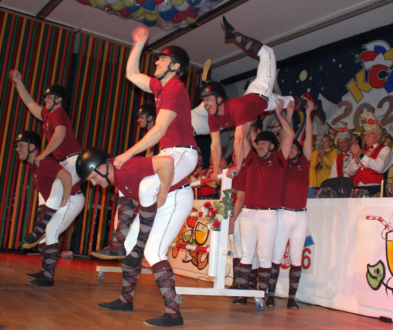 Wer dachte, jetzt kann nichts besseres mehr kommen, der hat noch nie in Kiedrich eine Fastnachtssitzung erlebt, die traditionell stets von der köstlichen-komischen, aber durchaus gekonnt akrobatischen Tanzdarbietung des hauseigenen Männerballetts „Die Meisjes“ gekrönt wird. In diesem Jahr hatten sich Maximilian Erkel, Janik Falkenstein, Elias Seyffardt, Tim Höfling, Max Huber, Jens Kirsch, Vincent Marsolek, Patrice Martellinghi, Benedikt und Tommy Paff, Philipp Weber und Konstantin und Sebastian Wolf in schicke Jockeys verwandelt, die mit ihren lustigen Steckenpferdchen beim urkomischen „Hobby Horsing“ sogar Bibi und Tina den Rang abgaloppierten und die Bühne und den Saal wahrhaft zum Beben brachten. Der Siegerpokal ging dabei ganz unbestritten an die Trainerinnen Julia Wolf und Katharina Höfling, die die Prachtkerle gut im Griff haben.