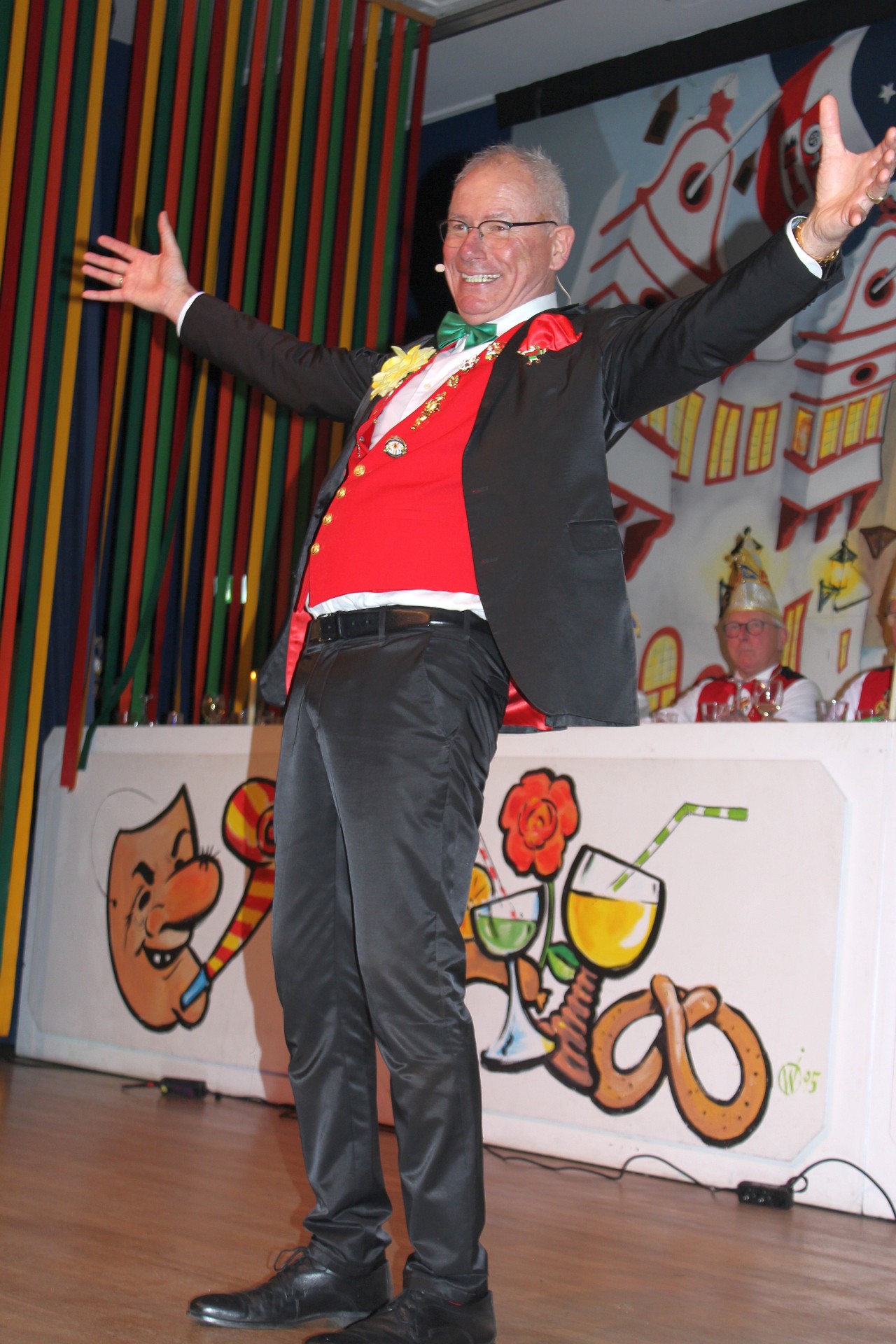 Die gehörte dann ganz und gar dem wohl derzeit berühmtesten Rheingauer Fastnachter, Gerd Brömser, der die Lachtränen nur so fließen ließ. Mit seinen herrlich komischen Schilderungen von „Shitstorm-Downloadern“, Kindern, die an Fastnacht kein Indianer-Kostüm anziehen dürfen, an Halloween alte Damen aber mit Totenköpfen und blutverschmierten Gesichtern erschrecken und Partyhäppchen auf verbogenen Löffeln, die keinen Hunger stillen, hatte er alle auf seiner Seite. Zum Glück brennt bei Gude Gerd nachts im Kühlschrank noch das Licht und der geliebten „Fleischworscht“ widmete er dann sogar noch eine Arie. Überhaupt schoss der Aulhausener Fastnachts- und Comedy-Star mit seinen großartigen Liedvorträgen als gestandener Tenor und Rapper wieder mal den Vogel ab.