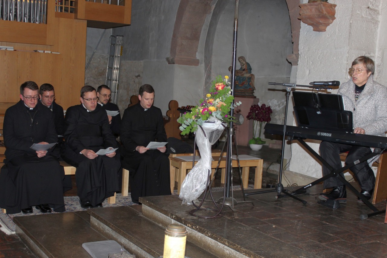 Anlässlich des 500. Friedensgebetes gestalteten vergangenen Montag die „Pilger des Heiligen Phillip Neri“ die 30 Minuten Gedenken mit. Diese Gruppe von angehenden Priestern und Pfarrern, zu denen auch der aus Mittelheim stammende Lucas Weiss gehört, strebt die Gründung eines kirchlichen Vereines an. Gemeinsam mit Pfarrer Weiss und Kaplan Mathias Böhm, der die Ansprache hielt, gestalteten Pfarrer Mark Stenger, Kaplan Fabian Bruns und Kaplan Tomek Kruszewski das Friedensgebet. Als besonderes Geschenk hatte die Pilgergruppe ein Banner übergeben, das im Rebenkranz das Motto des Friedensgebets „Meinen Frieden gebe ich Euch“ und das Wort Frieden in allen Weltsprachen zeigt. Das Banner zierte den Altar in der Basilika.
