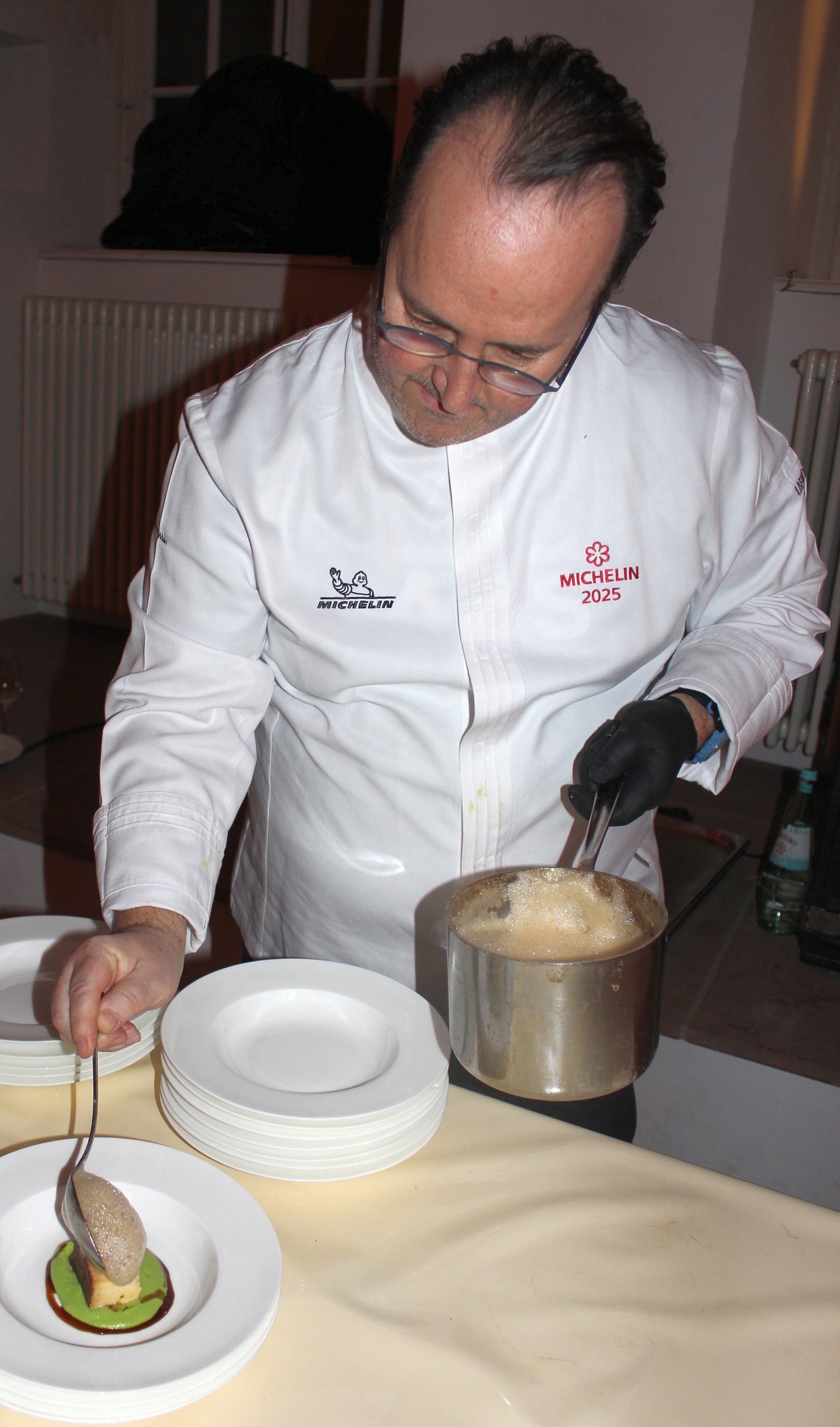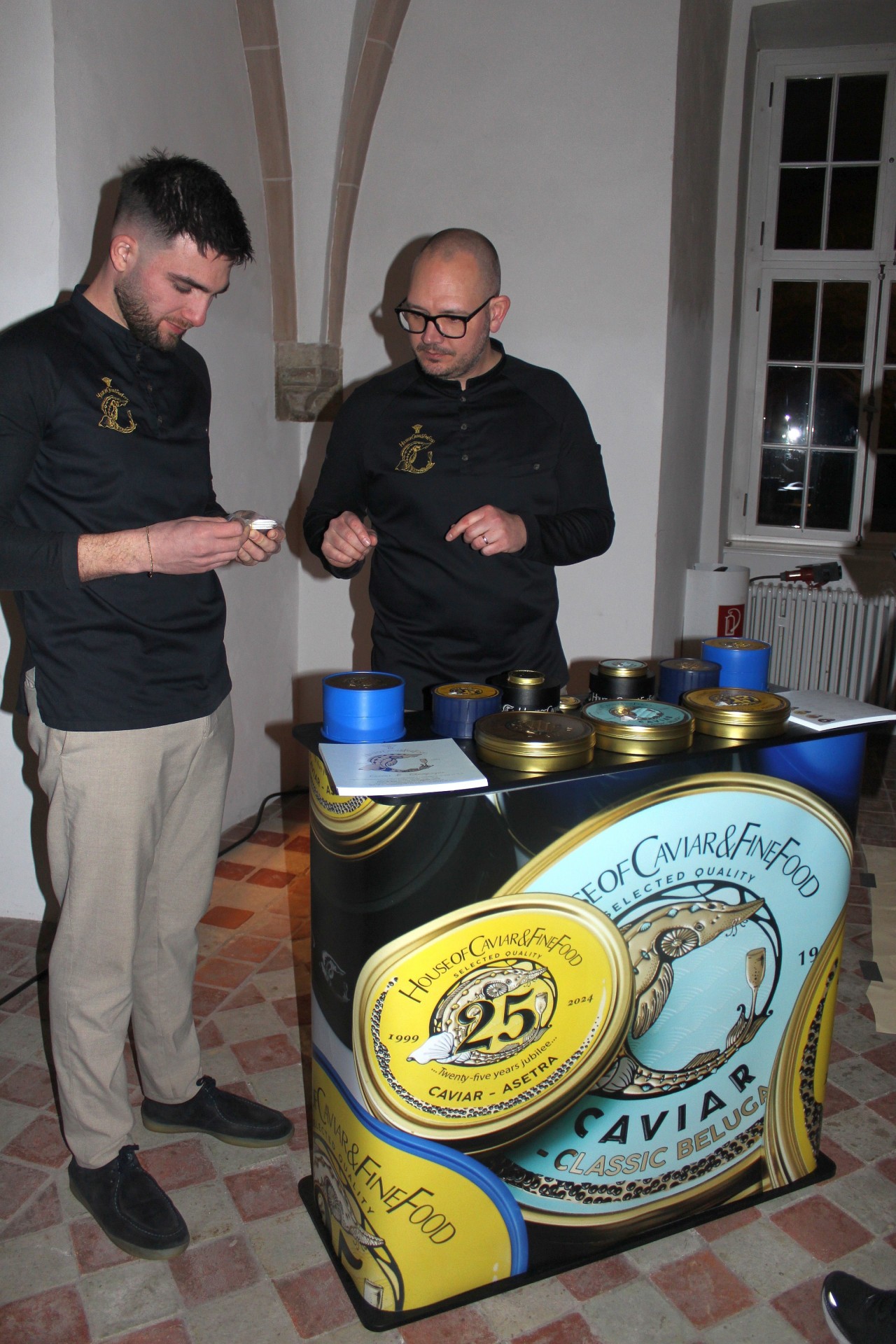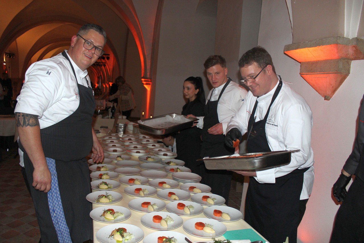 Am Herd standen außerdem 2-Sternekoch Jarno Eggen vom Restaurant de Groene Lantaarn in den Niederlande, die deutschen Sterneköche Domenik Alex vom Gasthof Alex in Weißenbrunn, Francesco Contiero vom „Irma La Douce“ in Berlin, Denis Feix vom „Marburger Esszimmer“, Hendrik Friedrich vom Restaurant „Weinstock“ im Hotel „Zur Schwane“ in Volkach und die geliebten „Wiederholungstäter“ Carmelo Greco und Benedetto Russo vom Carmelo Greco in Frankfurt, André Großfeld von der Villa Merton in Frankfurt und Wolfgang Becker von Becker’s in Trier. Ganz neu mit dabei auch Simon Kieslich von der Schloss-Schänke Johannisberg, der auch prompt mit seiner Gänseleberterrine, Gewürzbirne, Schokolade und Haselnuss die Gaumen der Gäste faszinierte. Die Sterneköche, die vor Ort selbst alle Gerichte kredenzten, servierten wundervolle Köstlichkeiten wie Jakobsmuscheln an Lauch, Estragon und Macadamia oder Royale di Parmigiano Reggiano 37 Mesi mit Espresso-Schaum und Orangen, confierte Entenkeule mit Kürbis und Myoga, Fusilli mit Reduktion von der Bouillabaisse, Piroggi und Essenz von der Eifel-Ente an Röstzwiebel in Sauerrahm, geflämmten Kabeljau mit bunter Beete und Fichte oder Rindertatar mit Gänseleber-Eis und Focaccia. Eine Besonderheit war auch der Zwieback von der Kartoffel an Schnittlauchcreme und Asetra-Kaviar von „The house of caviar", kredenzt von Zweisterne-Koch Jarno Eggen aus den Niederlanden. Sagenhafte sechs Kilogramm Kaviar hatte er den Gästen im Kloster Eberbach an diesem Abend auf den Teller gebracht.