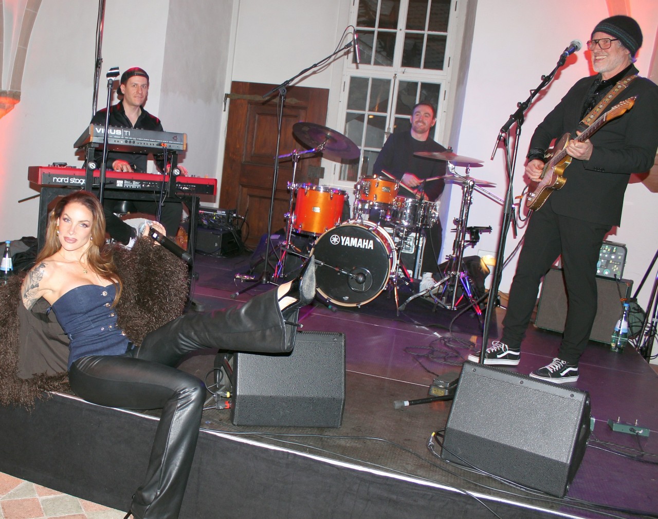 Die Gäste hatten sich in den weitläufigen Räumen verschiedene Plätze gesucht und schlenderten den ganzen Abend von Weinstand zu Weinstand und von Koch zu Koch. Im gemütlichen Gespräch wurden Speisen und Weine im Stehen verkostet oder auch zwischendurch mal in verschiedenen Gruppen an den Tischen. Daraus ergab sich eine besonders lockere Atmosphäre und eine Stimmung, wie sie eben auf gelungenen Partys herrscht. Dazu heizte die Live-Band „Glow“ mit ihrer rassigen Sängerin die Stimmung an. Selbst das dickste Eis kam hier zum Schmelzen und so rückten fremde Menschen im Laufe des Abends immer näher zusammen und kamen ins Gespräch. So auch eine ganz Familie aus Tübingen, die dank eines Rheingauer Freundes in diesen Genuss kam oder der Hobbykoch aus Würzburg, der ganz alleine gekommen war, um sich ohne Ablenkung auf die Genüsse des Abends einzulassen und dieses „Ritual“ schon seit einigen Jahren pflegt. Er schätze die freundliche Gastlichkeit und kulinarischen Genüsse beim edlen Wein im Rheingau sehr.