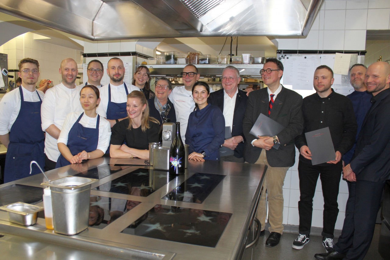 Als Küchenchef für den Abend hatten die Gastgeber H.B. Ullrich und seine Tochter Johanna Ullrich den Sternekoch Daniel Schimkowitsch gewinnen können. Dessen Werdegang zum zwei Sterne-Koch-Star ist spektakulär: Nach seiner Ausbildung im Grand Hotel Sonnenbichl in Garmisch-Partenkirchen ging Schimkowitsch 2004 zum Burghotel Wernberg zu Christian Jürgens, der auch mit zwei Michelin-Sternen dekoriert ist. Mit Jürgens wechselte er im Juli 2008 zum Gourmetrestaurant „Überfahrt“ in Rottach-Egern. Fünfeinhalb Jahre arbeiteten die beiden im Team. Im Juli 2009 wurde Schimkowitsch Küchenchef im Restaurant Tramin in München, das 2012 mit einem Michelin-Stern ausgezeichnet wurde. Im Januar 2014 wechselte er als Küchenchef zum „Ketschauer Hof“ in Deidesheim. Auch hier wurde sein Restaurant „L.A. Jordan“, benannt nach dem früheren Bürgermeister und Weingutsbesitzer Ludwig Andreas Jordan, mit einem Michelin-Stern ausgezeichnet. 2023 erhielt es zwei Michelin-Sterne. „Seine französisch orientierte Küche ist mit asiatischen Aromen akzentuiert. Feingefühl für Aromen und spektakuläre Kreationen prägen seinen Kochstil“, stellte ihn Gastgeberin Johanna Ullrich zu Beginn des Abends vor und versprach nicht zu viel: Daniel Schimkowitsch erstaunte dann auch wirklich mit kulinarischen Höhenflügen, die selbst eingeschworene Gourmetpäpste unter den zahlreichen Gästen überzeugten. Schimkowitsch hatte ein sehr raffiniertes Menü in fünf Gängen parat, dazu ein verblüffendes Amuse mit Wan Tan vom Skipjack mit Habanero, Bärlauchblüte und Umamibrühe und einem zweiten Dessert mit Buchteln wie bei der Großmutter, raffiniert mit Champagner-Karamell Powidl und Vanillesauce serviert. Das Menü hatte er speziell auf die Sekte der besten deutschen Sekthäuser abgestimmt.