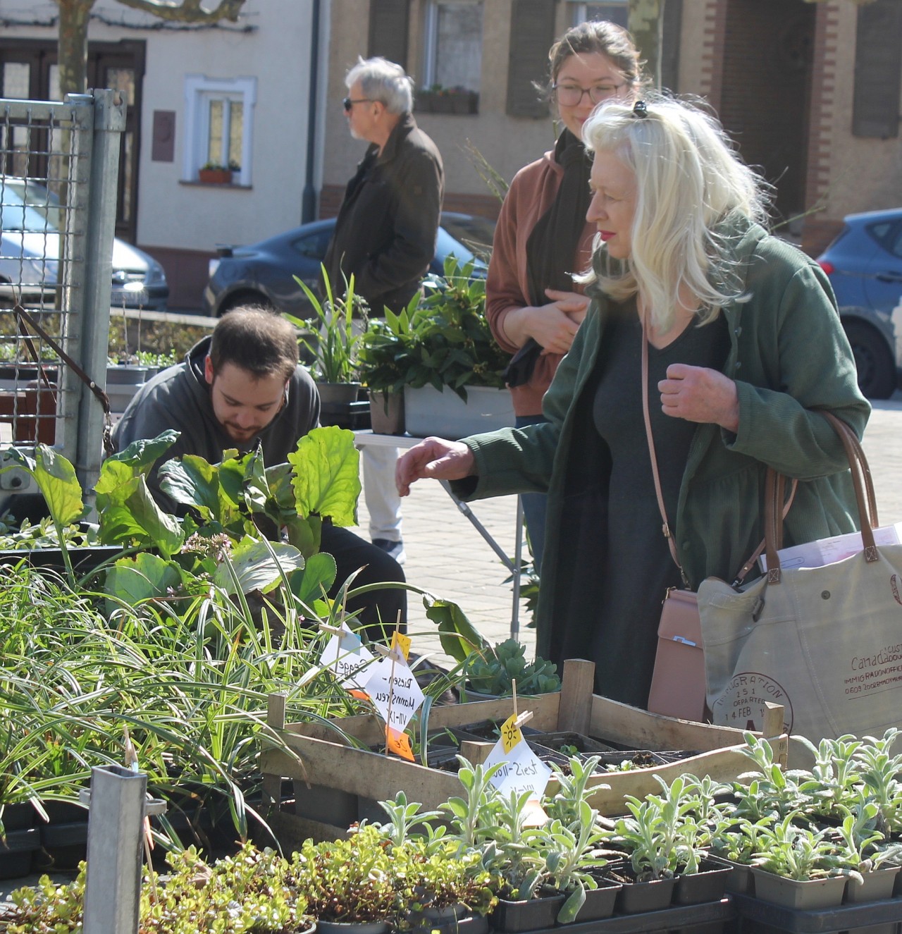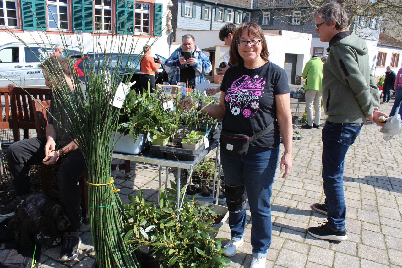 Bärbel Kremer-Kohl gehörte über Jahre hinweg auch zu den treuen Gästen der Pflanzenbörse der Rheingauer Gartenfreunde in Geisenheim. Dieser legendäre „Pflanzenmarkt“ zog bis zur Corona-Pandemie jedes Jahr im Frühjahr hunderte Besucher aus der Region an, die sich hier mit günstigen Gemüse- und Zierpflanzen für Balkon und Garten eindeckten. Mit Wäschekörben voller Pflanzen waren die Kunden der Gartenfreunde damals nach Hause gegangen. Aus Altersgründen haben die Vereinsmitglieder in Geisenheim die Pflanzenbörse eingestellt. Doch begonnen hatte damals alles so ähnlich wie jetzt in Erbach: „Ursprünglich hatte man einen Pflanzentausch unter den Gartenfreunden einmal jährlich im Frühjahr ins Leben gerufen. Daraus ist eine Börse geworden, bei der die Gartenfreunde Blumen und Gemüsepflanzen in bester Qualität und besondere Exoten anboten“, erinnert sich Bärbel Kremer-Kohl. Selbst eine begeisterte Hobby-Gärtnerin, bedauerte sie die Schließung der Börse und kam schließlich auf die Idee, mit dem Verein Umweltzukunft Rheingau selbst eine eigene Samen- und Pflanzenbörse zu organisieren. Das Augenmerk sollte dabei auf heimischen und gefährdeten Pflanzen liegen, die die Insektenwelt vor Ort fördern. Und tatsächlich gab es an vielen Ständen Wiesen-Schafgarbe, Frauenmantel, Knoblauchrauke, Färberkamille, Wiesenkerbel, Strand-Grasnelke, Beifuß, Heilziest, Bergminze, Glockenblumen, Schaumkraut, Flockenblumen, Wirbeldost, Karthäusernelken oder Zimbelkraut zu kaufen und tauschen.