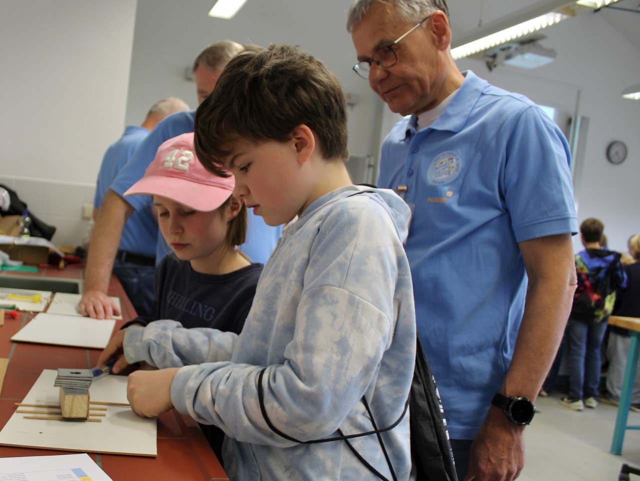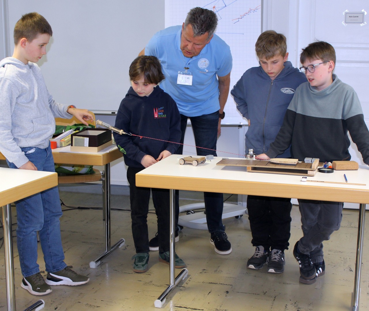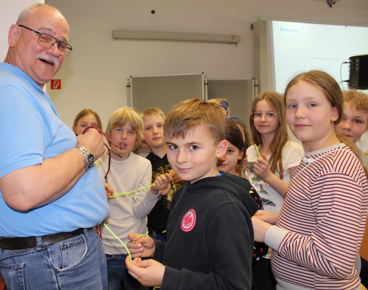 Und um das zu erreichen, beschäftigten sich die Kinder eingehend mit dem Thema „Reibung“. Gespannt hatten die Mini-Studenten dem Kollegen des VDI, dem Diplom-Ingenieur Gerd Munder, bei seinem Einführungsvortrag gelauscht. „Reibung ist eine Kraft, die zwischen Teilchen oder Körpern wirkt, die aneinander liegen. Es gibt unterschiedliche Arten von Reibung, wie Rollreibung, die schon im alten Ägypten genutzt wurde, um die schweren Steine für den Bau der Pyramiden zu transportieren. Reibung ist wichtig, ohne sie könnten wir uns nicht fortbewegen, nichts festhalten“, sagte Munder, und lud zum Gedankenexperiment: „Könnt ihr auf Eis Fußball spielen? Wahrscheinlich nicht, denn die Reibung ist zu gering und man könnte nicht schießen“.