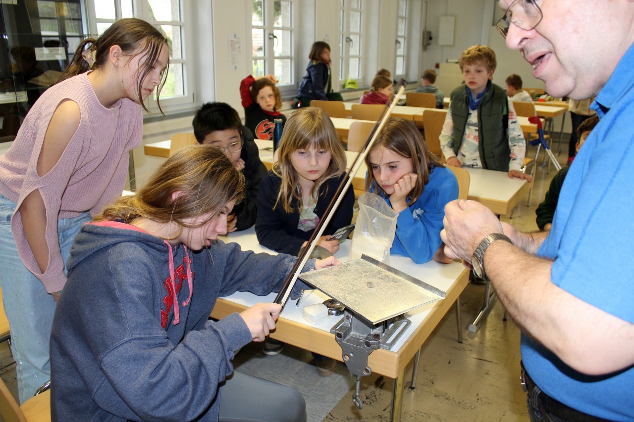 Geisenheim. (sf) Mit viel Gefühl schwang die kleine Karla den Geigenbogen sanft an der Kante der Eisenplatte entlang. Auf der befand sich ein kleines bisschen Sand, der sich jedes Mal, wenn die Zehnjährige aus Winkel den Bogen über die Kante zog, in kleine Wellen legte und so ein wunderschönes Muster bildete. Der Ton, den sie dabei erzeugte, ließ allerdings eine gruselige Gänsehaut bei den Umstehenden aufkommen. „Wie, wenn man über eine Tafel kratzt“, meinte Karlas Freundin Nele. Doch das Experiment „Mit dem Geigenbogen Sandmuster erzeugen“ war einer der Höhepunkte der neuesten Vorlesung an der Kinderuni der Hochschule Geisenheim und machte den Mini-Studenten riesigen Spaß.