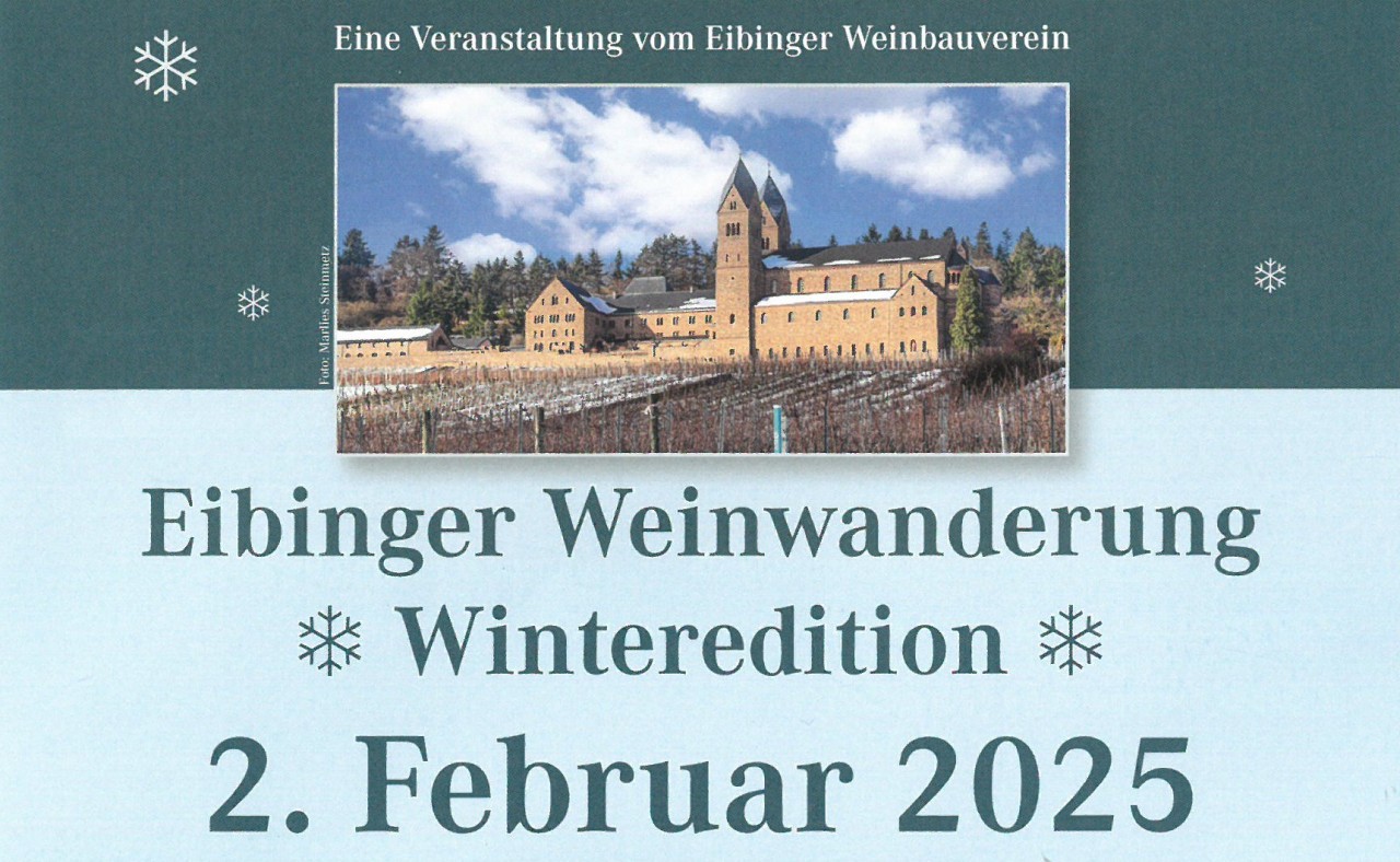 Die Eibinger Weinwanderung als Winteredition am Sonntag, 1. März 2026 von 11.00 bis 18.00 Uhr - ein lockerer Weinspaziergang durch die Rüdesheimer Weinlagen bei Eibingen unterhalb der Abtei St. Hildegard.