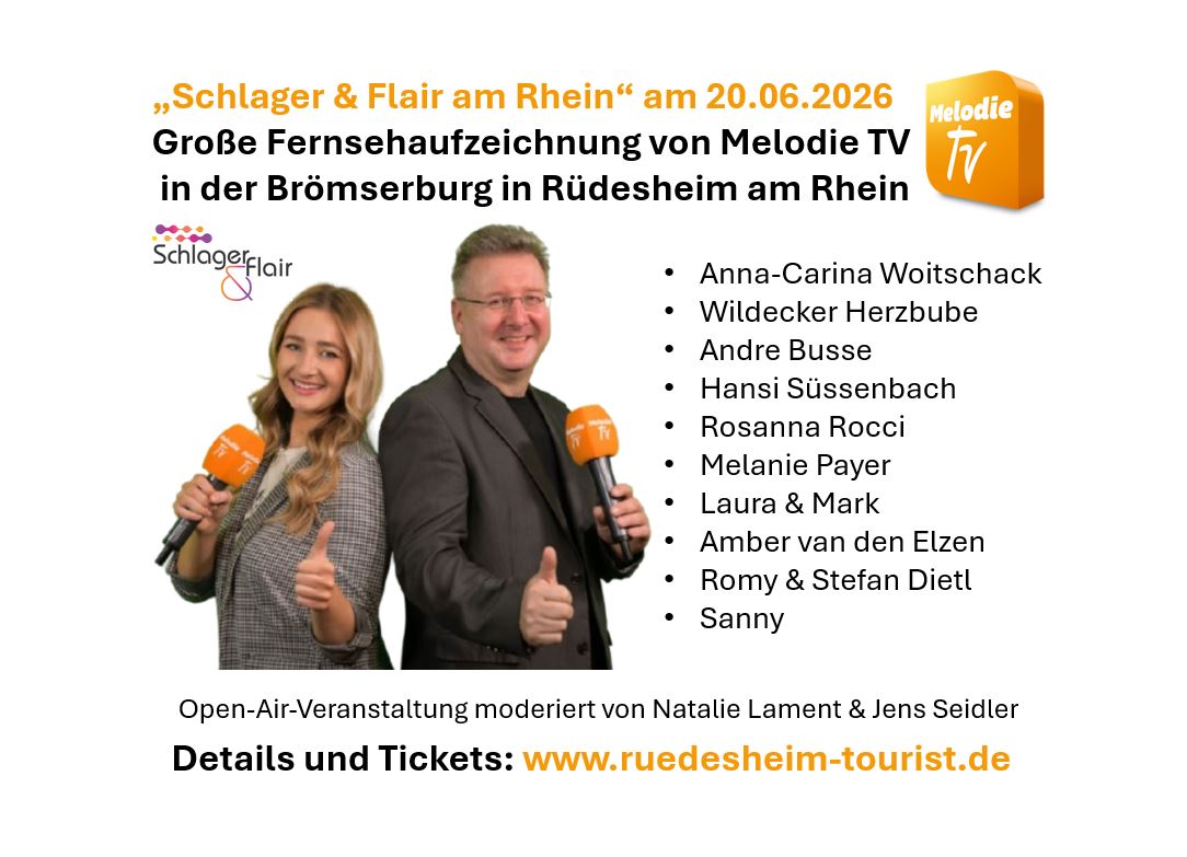 Musik, Emotionen und Rheinromantik pur! Beim großen Open-Air „Schlager & Flair am Rhein“ erwarten Sie Stars, Stimmung und unvergessliche Momente – moderiert von Natalie Lament & Jens Seidler (Melodie TV)