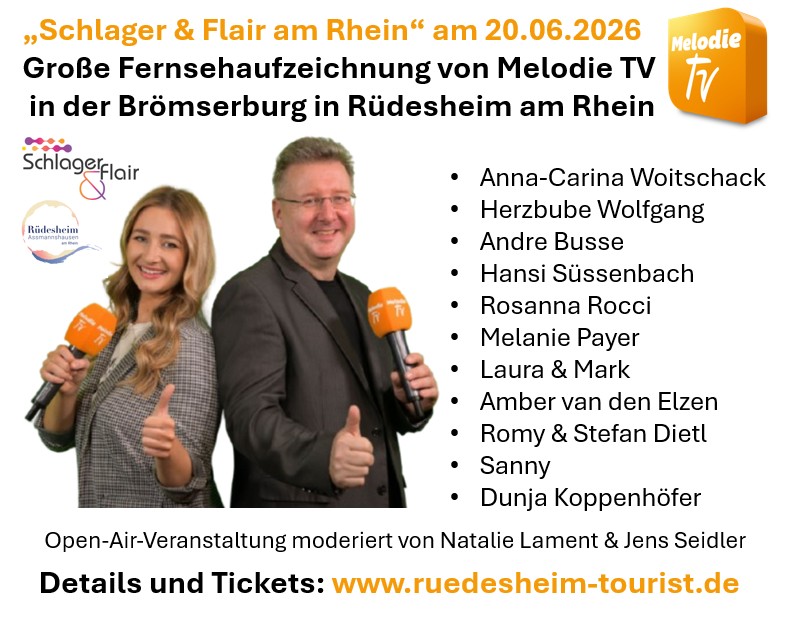 Am 20. Juni 2026 heißt es Musik, Emotionen und Rheinromantik pur! Beim großen Open-Air „Schlager & Flair am Rhein“ erwarten Sie Stars, Stimmung und unvergessliche Momente – moderiert von Natalie Lament & Jens Seidler (Melodie TV)