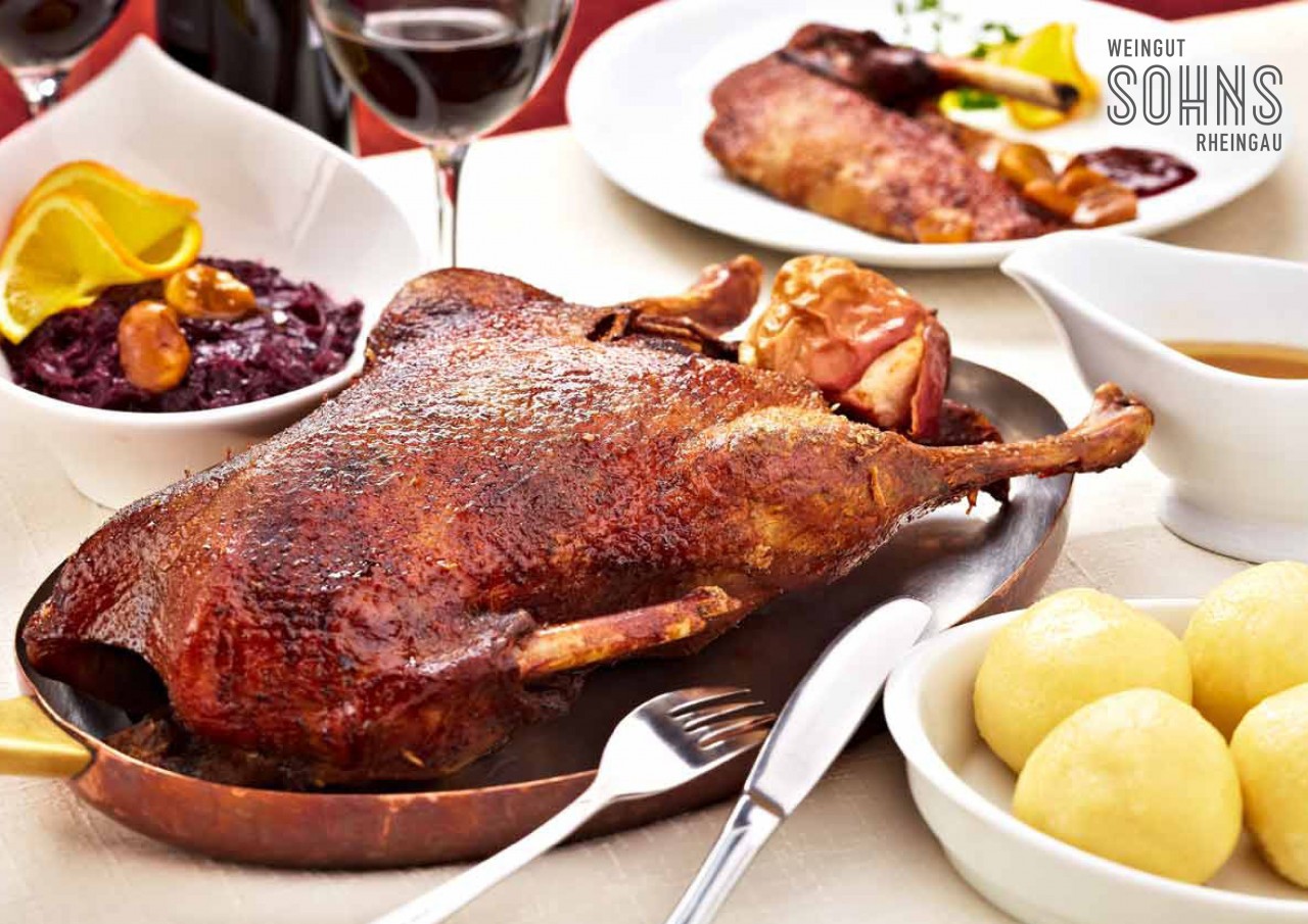 Gemeinsam mit Rotkohl, Schmorapfel, Maronen, Klößen und Sauce servieren wir die Gans im 3-Gang-Menü inkl. Vorspeise und Dessert zum Preis von 65 Euro pro Person. Auch an eine fleischlose Alternative wurde gedacht.